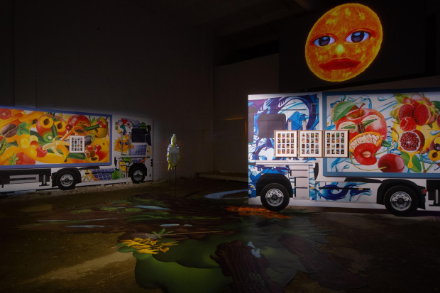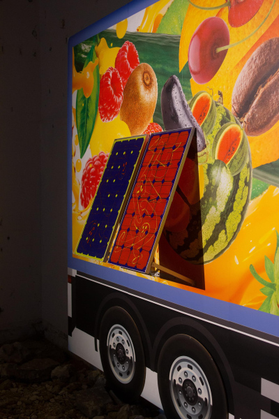 In Under the Sun, the works of Eric Giraudet de Boudemange, Agnieszka Polska, Līga Spunde, and Agate Tūna form an entangled universe. Polska’s video The New Sun casts its presence across the exhibition.Its childlike celestial narrator drifting between melancholy and absurdity as it addresses Earth through surreal monologues, love poems, and prophetic warnings. The sun speaks from above, simultaneously witness and participant, offering a poetic lens on crisis, responsibility, and the fragile cycles of life on Earth. Around this work, Giraudet and Tūna each developed new work that extend their ongoing artistic inquiries while responding to the context of TUR and the themes of the exhibition. Giraudet’s installation centres on two monumental truck forms, both sculptural objects and conceptual vehicles. They anchor an allegorical inquiry into movement, extraction, and exchange, forming a framework of objects and references that evoke the systems through which not only goods, but also values and beliefs, are transported across landscapes. Giraudet’s work reflects on how agricultural cycles shape our relationships to labour, nourishment, and survival, offering a layered perspective on the infrastructures that sustain, and strain, contemporary life.