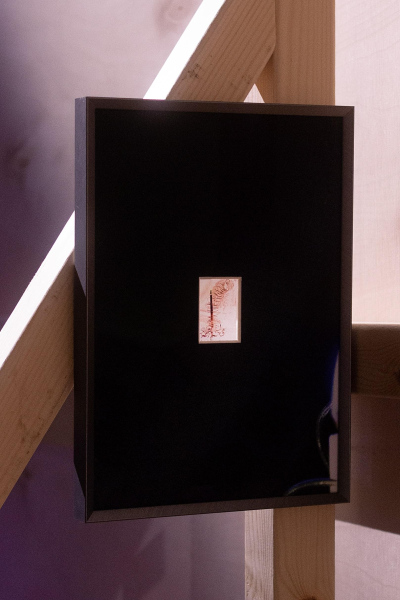 With the final step in the process, placing the work in the unique space of TUR_telpa, Kurševa remains meticulous and attentive to conceptual and aesthetic details. The delicate wooden structure holding the drawings, seemingly as light as the drawings themselves, is somehow kindred to the massive 5 by 5 by 5 box that has been central to TUR_telpa during the cold winter months. The foggy materiality of the images - creating a sense of lightness and adding to the overall sensory experience - are also reflected in the opaqueness of the semi transparent surfaces that filter light into the exhibition space. Even the projected loop and the white wall that receives it seem to share an erratic quality that make it almost one.