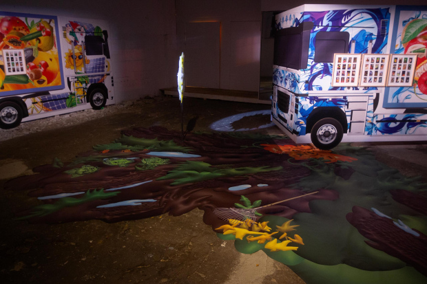 Izstādē “Zem saules” Ērika Žīrodē de Būdemanža, Agņieškas Polskas, Līgas Spundes un Agates Tūnas darbi veido savstarpēji savītu visumu. Polskas video darbs The New Sun (“Jaunā saule”) piepilda izstādes telpu ar savu klātbūtni. Tā bērnišķīgais debesu stāstītājs, balansējot starp melanholiju un absurdu, uzrunā Zemi sirreālos monologos, mīlas dzejoļos un pravietojumos. Saule runā no augšas, vienlaikus kā lieciniece un dalībniece, piedāvājot poētisku skatījumu uz krīzi, atbildību un trauslajiem dzīves cikliem uz Zemes. The New Sun kalpojis kā impulss Žirodē de Būdemanžam un Tūnai radīt jaunus darbus, kas vienlaikus turpina viņu ilgstošo māksliniecisko izpēti un reaģē uz TUR kontekstu un izstādes tēmām. Žirodē de Būdemanža instalācijas centrā ir divas monumentālas kravas automašīnu formas, kas funkcionē gan kā skulpturāli objekti, gan kā konceptai transportlīdzekļi. Tās atklāj alegorisku skatījumu uz kustību, ieguvi un apmaiņu, uzsverot, ka pāri ainavām tiek pārvietotas ne vien preces, bet arī vērtības un uzskati. Žirodē de Būdemanža darbs atspoguļo, kā lauksaimniecības cikli veido mūsu attiecības ar darbu, uzturu un izdzīvošanu, piedāvājot daudzslāņainu skatījumu uz infrastruktūrām, kas vienlaikus uztur un noslogo mūsdienu dzīvi.