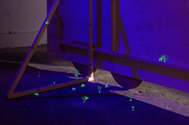 But the essence of this opposition, self-consciousness and experience is to be found in the title work at the center of the show, a construction that creates a conceptual, literal and physical counterweight to the beauty of Mūrnieks’ visual pleasure theory. Perhaps the opposite pole of the admiration of beauty is located in the still-current chauvinism and recognition of one’s sins? Are these matters perhaps too heavy to allow an innocuous pleasure? Be that as it may, it’s important to discuss them. Even if it makes one afraid that this line of thought could lead to appropriation.