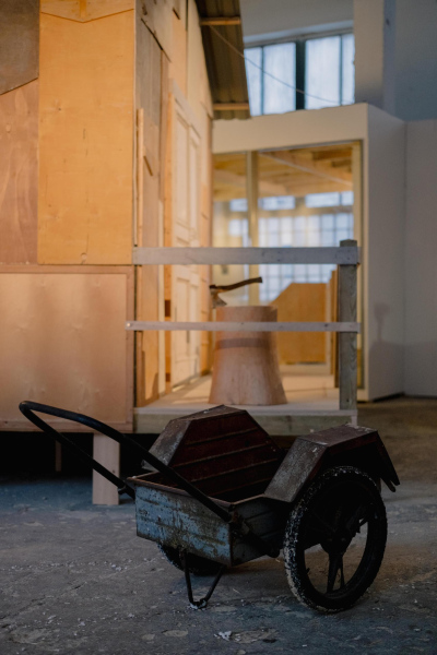 A slow pig digs deep roots. And finally we arrive at the place where we would settle. All that was left was one and a half buildings, some large trees, a bit of snow, and some ruins. No one had told us anything about this place. Perhaps the site itself was summoning us. The exhibition was a conversation that turned into a physical manifestation during the creative process. By co-experiencing the move to an environment that defines a return to relatively primitive beginnings, the surrounding materials and activities equally become fundamental everyday building blocks and sources of inspiration. Earth, stone, wood, wool, branches, materials for a roof. Spatial objects alternate with their likenesses and representations on the plane, undergoing further transformation in non-linear space.