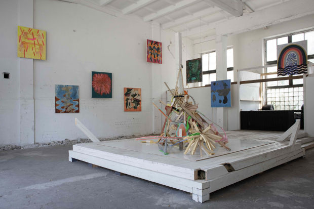 Katrīna Biksone’s Anatomy of a Busy Line invites visitors into a gently disorienting space that is shaped by her perception of the pressures of hyperconnectivity in a contemporary world. The installation, largely composed of six cubicle-like spaces, is ambient, more atmosphere than statement. Primarily through painting, accompanied by sculptural interventions, Biksone composes an environment in TUR where attention slips, connection falters, and the familiar routines of contact are rendered open to reflection. These quiet spaces evoke the small negotiations between presence and absence, attention and retreat, that characterize life in a world where being reachable has become a baseline condition.