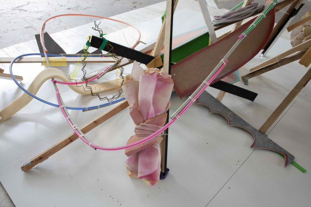 But the essence of this opposition, self-consciousness and experience is to be found in the title work at the center of the show, a construction that creates a conceptual, literal and physical counterweight to the beauty of Mūrnieks’ visual pleasure theory. Perhaps the opposite pole of the admiration of beauty is located in the still-current chauvinism and recognition of one’s sins? Are these matters perhaps too heavy to allow an innocuous pleasure? Be that as it may, it’s important to discuss them. Even if it makes one afraid that this line of thought could lead to appropriation.