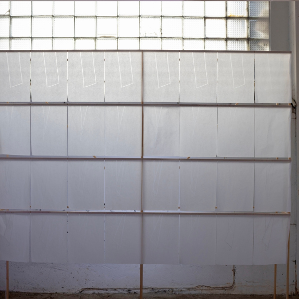 Nearly 300 drawings made with varnish on semi transparent paper gently sway from an intricate wooden structure. Each drawing is a moment of movement of a solitary sheet of paper as it swings from beginning to end to beginning again. A frame by frame animation made up of the drawings form a loop projected on the wall. Together, these frames of animation presented as drawings in space and as a projected loop create a sense of dynamization of space and spatialization of time.