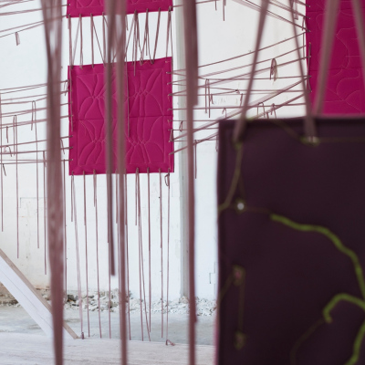 Katrīnas Biksones instalācija "Aizņemtās līnijas anatomija" ielūdz apmeklētājus viegli dezorientējošā telpā, kas izriet no mākslinieces uztveres par hipersavienotības radīto spiedienu mūsdienu pasaulē. Instalācija, kuras centrā atrodas sešas kabīnēm līdzīgas telpas ir visaptveroša un noskaņu veidojoša. Izmantojot glezniecību kā galveno mediju līdztekus skulpturālām intervencēm, Biksone TUR telpu veido kā vidi, kurā uzmanība viegli aizslīd, savienojumi pārtrūkst, un ierastie saziņas ritmi kļūst par pārdomu objektu. Šī klusā, atmosfēriski uzlādētā telpa atgādina par ikdienišķo kaulēšanos starp klātbūtni un prombūtni, uzmanību un atkāpšanos – par tām smalkajām pretrunu niansēm, kur pastāvīga sasniedzamība kļuvusi par normu.