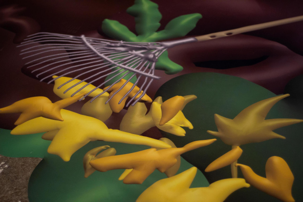 Peeling off the layers of the exhibition, one slowly discovers a symbolic and nuanced opposition against the illustrating, objectifying male gaze. This is embodied by the works’ visual abstraction and the conflict among the materials which have been put to use. Polyurethane foam is pressing through the scrupulously built metal frames and latex, with Mūrnieks’ author's technique leaving wounds, scars and stretch marks on the polished body parts of the female images.