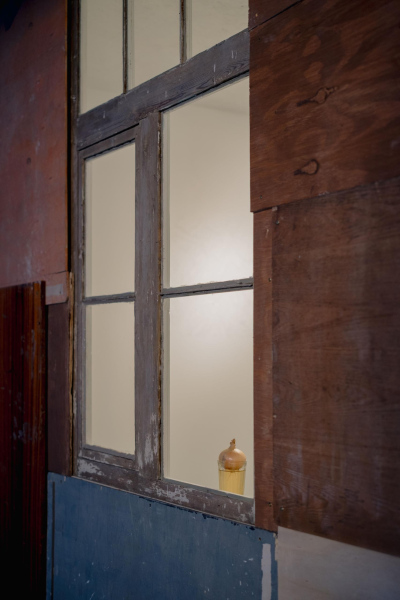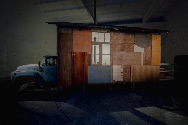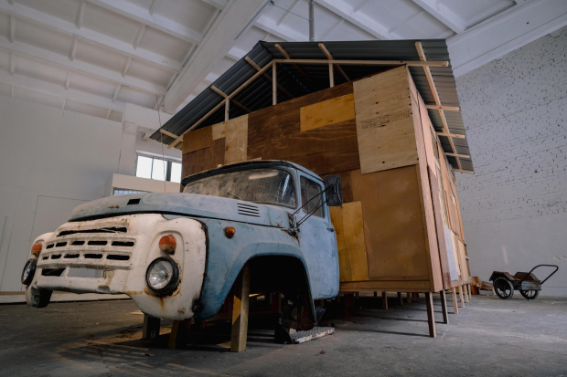 In “Artifacts of Process,” these concerns take form through two closely connected elements: a physical sculptural structure and the process-driven work that this structure sustains. At TUR, a former garage for emergency vehicles now functioning as a space for contemporary art, Ozoliņš constructed a building from repurposed wood that appears to be hauled by the remnants of a ZIL-130 truck cabin. The structure carries references to use, repair, and continuity, while its interior adopts the restrained language of the white cube gallery. Within this setting, Ozoliņš establishes a framework in which process and outcome remain inseparable. The work unfolds over time through a series of predetermined actions, allowing results to accumulate, shift, and develop as the exhibition progresses.