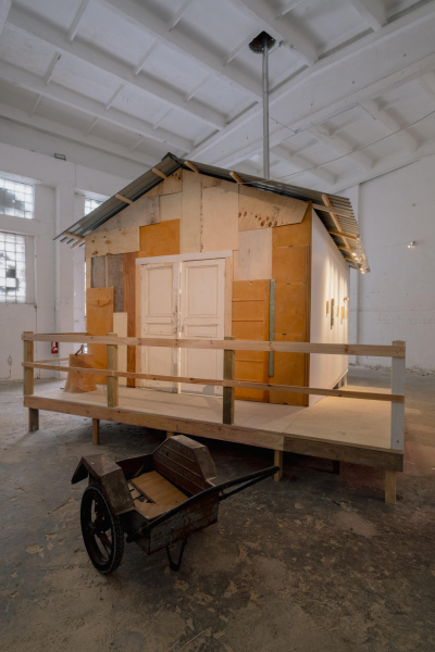A slow pig digs deep roots. And finally we arrive at the place where we would settle. All that was left was one and a half buildings, some large trees, a bit of snow, and some ruins. No one had told us anything about this place. Perhaps the site itself was summoning us. The exhibition was a conversation that turned into a physical manifestation during the creative process. By co-experiencing the move to an environment that defines a return to relatively primitive beginnings, the surrounding materials and activities equally become fundamental everyday building blocks and sources of inspiration. Earth, stone, wood, wool, branches, materials for a roof. Spatial objects alternate with their likenesses and representations on the plane, undergoing further transformation in non-linear space.