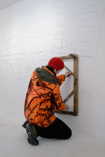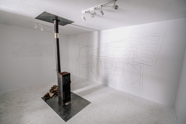 For his exhibition, Ozoliņš has established a set of limitations and rules that reflect the ideas he finds important. His personal journey, as an artist and citizen of Latvia, connects to broader realities shared by artists and art spaces more generally, as well as to questions of Latvian heritage and the everyday effort required to meet basic needs. These concerns come together through a process that unfolds over time before it is expressed in a single finished gesture. Through a conceptual choreography, Ozoliņš carries out a series of daily actions throughout the five week duration of the exhibition. He forages the city streets in search of wood, traces the collected material in a large, developing drawing, and cuts the wood to be used as fuel for the fire, while setting aside selected pieces to be transformed into artworks. Burning the wood generates warmth, meeting a basic need for shelter and heat within the space. Alongside this, he records the locations where the wood is found by marking them on a map. Once these actions are completed, he creates new works from the gathered materials and from elements of the truck cabin, bringing what he encounters in the present into dialogue with a fragment of heritage.